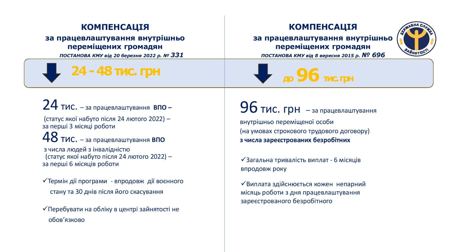 Розмір компенсації: 8000 гривень щомісяця за працевлаштовану ВПО.
