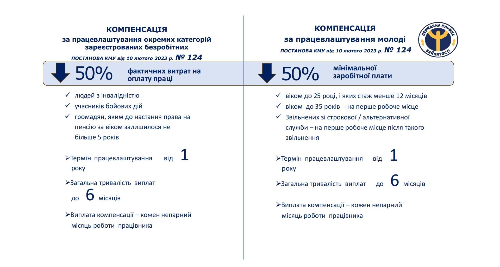 За працевлаштування безробітних соціально незахищених категорій роботодавець отримує або відшкодування нарахувань на заробітну плату (ЄСВ), або фактичні витрати на заробітну плату, або компенсацію у розмірі мінімальної заробітної плати. До квотних категорій відносяться матері/батьки з дітьми до 6 років, особи передпенсійного віку, УБД, молодь тощо. Порядок надання компенсації витрат за працевлаштування зареєстрованих безробітних затверджений постановою КМУ від 10 лютого 2023 р. № 124