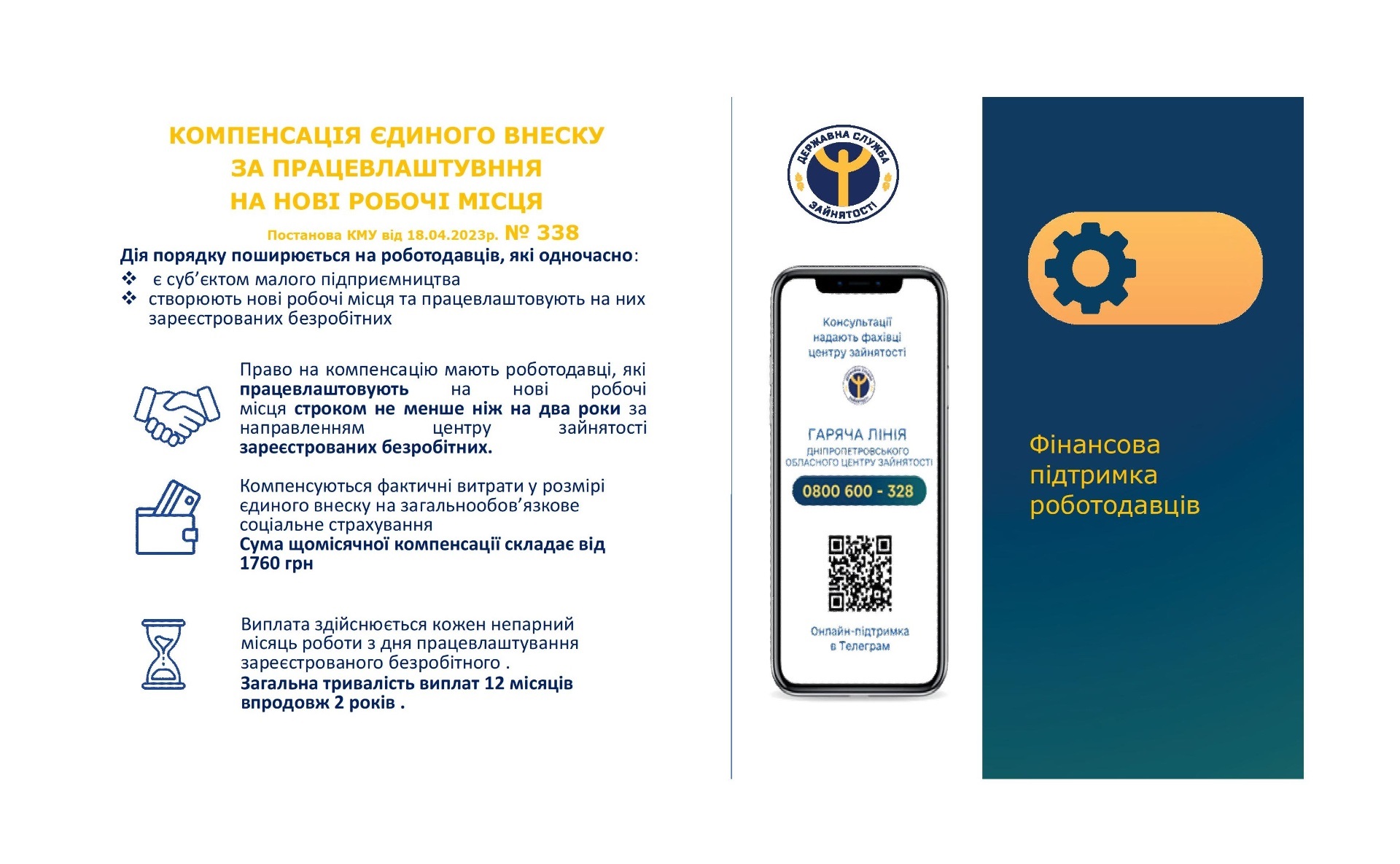 Порядок компенсації суб’єктам малого підприємництва фактичних витрат у розмірі єдиного внеску на загальнообов’язкове державне соціальне страхування за працевлаштування зареєстрованих безробітних на нові робочі місця. Постанова № 338 від 18.04.2023 року «Деякі питання надання роботодавцям компенсації єдиного внеску на загальнообов’язкове державне соціальне страхування за працевлаштування на нові робочі місця».